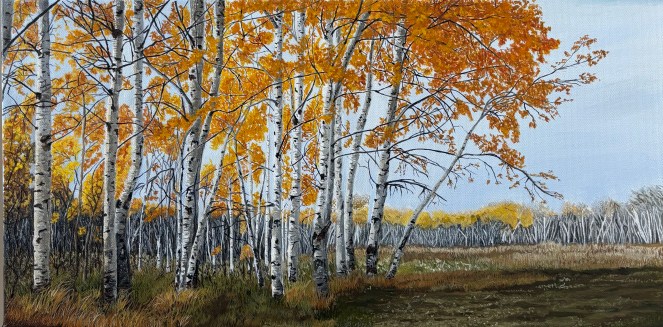 Aspen Forest – Acrylic on 18” x 24” canvas block. Aspen Forest is a captivating acrylic painting that immerses the viewer in the enchanting beauty of nature during the autumn season.