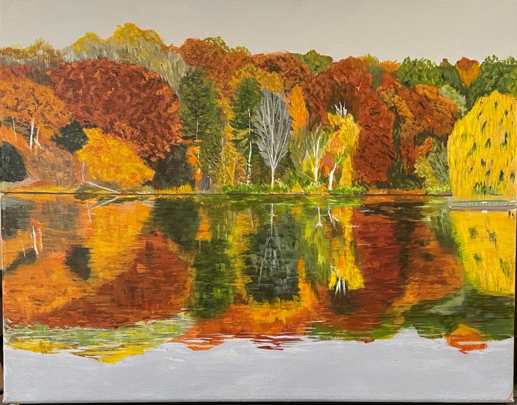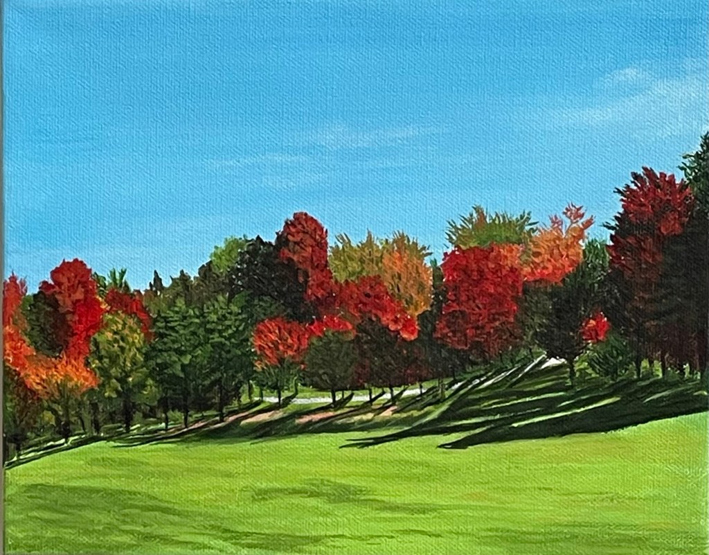 Acrylic Painting – 11” x 14” on stretched canvas. The photo reference is from an art class I joined in the fall of 2023. I typically gravitate to the more vibrant colours of fall but this one has a nice variety of deeper colours.