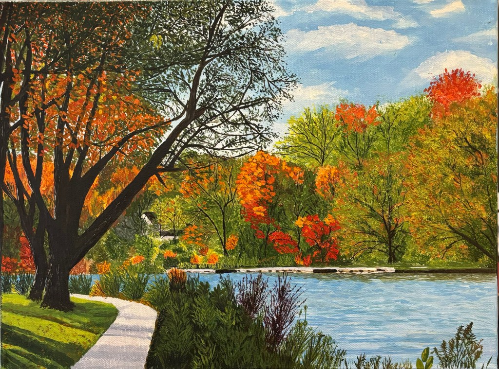 My interest in landscape paintings has always been stimulated by the fall colors in Ontario. This city has a vibrant downtown which includes excellent walking paths around the lake and river. The fall colors are just exquisite.