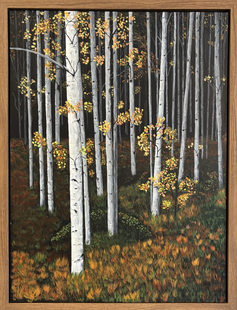 Aspen Forest – Acrylic on 18” x 24” canvas block. Aspen Forest is a captivating acrylic painting that immerses the viewer in the enchanting beauty of nature during the autumn season.