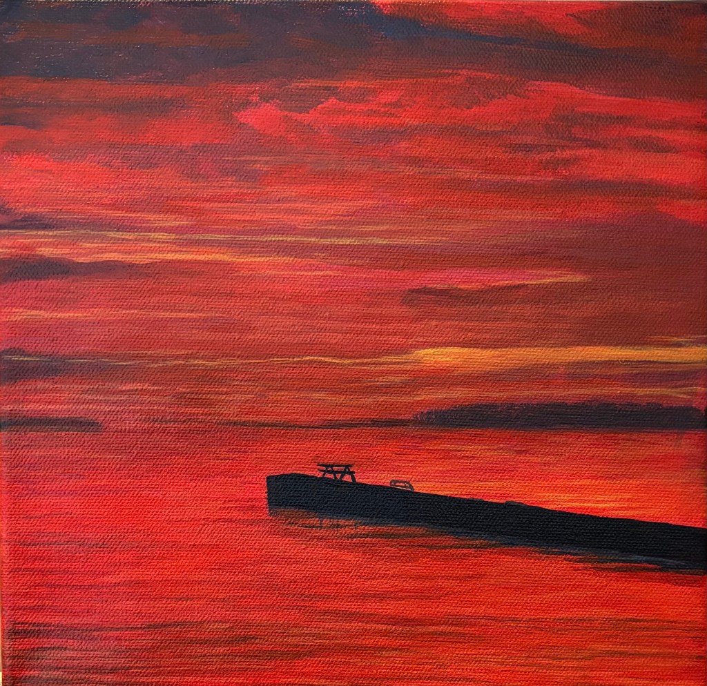 Red Bay’s Stormy Glow – a 10″x10″ acrylic piece on gallery stretched canvas. This painting captures a dramatic silhouette of a pier against a vivid red and orange sunset inspired by the small village of Red Bay on Lake Huron in Ontario. The intense colours and textures convey the power and warmth of a storm brewing over the lake.