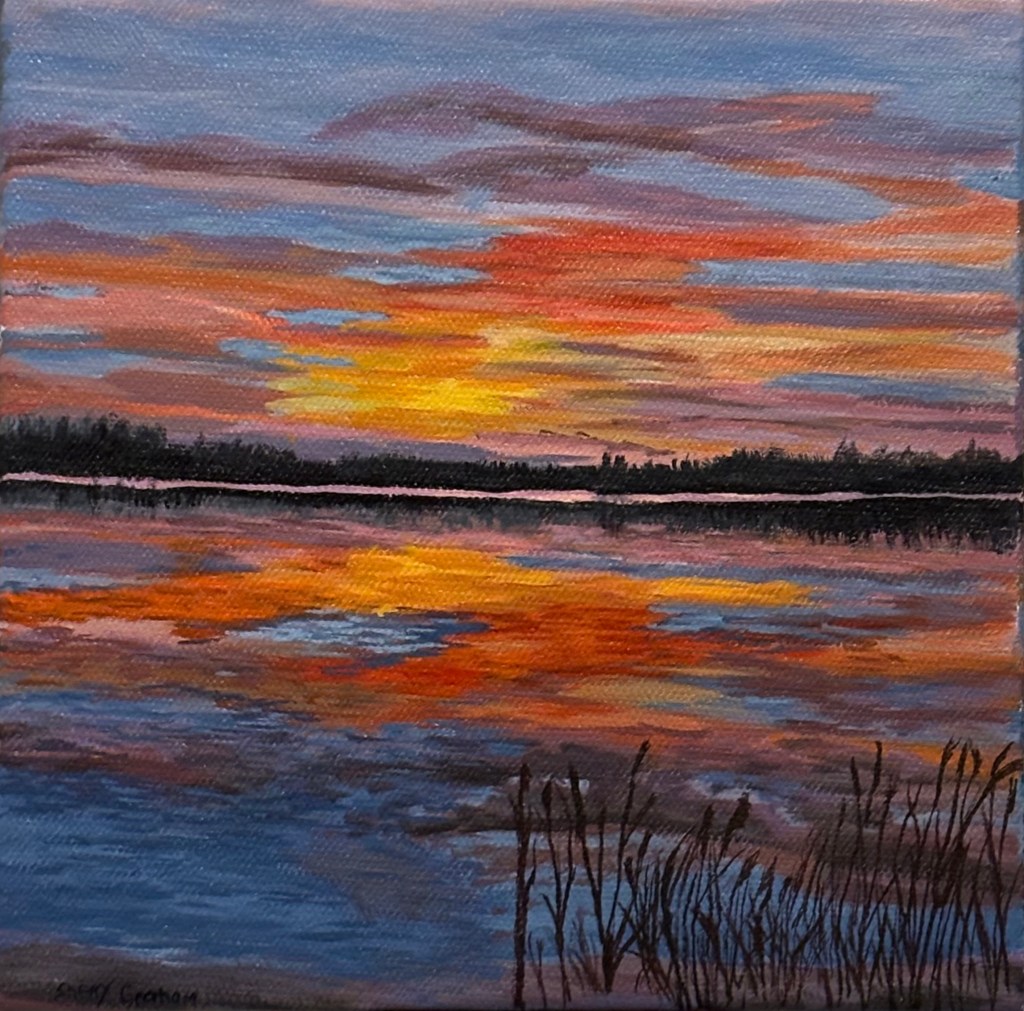 Colour Reflections is an 8″x8″ acrylic painting on canvas block. It captures a sunset over Red Bay Ontario on Lake Huron, a calm lake, blending warm and cool colours with reflections on the water. Red Bay is famous for it’s immensely vibrant red sunsets.