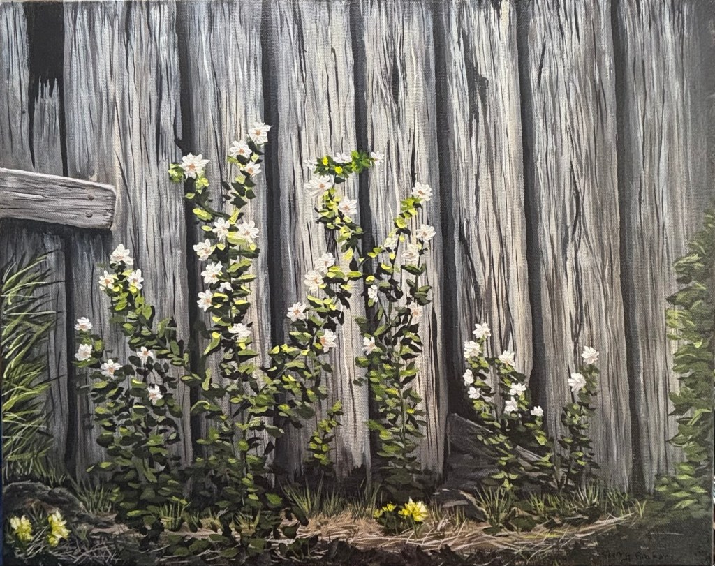 This is an acrylic painting on a 16″x 20″ gallery stretched canvas. The piece features a rustic wooden barn paired with white flowers and green foliage. This contrast brings life and serenity to the scene. Inspired b y my love for old barns and fences, this painting combines aged textures with delicate blooms.