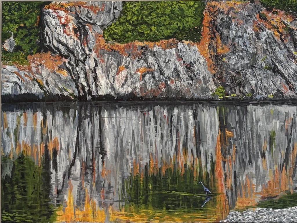 Acrylic painting on 18 x 24” canvas. This is a painting that brings together the quiet strength of a rocky cliff and the stillness of water beneath. I used both a palette knife and brush to capture the textures of weathered stone and the soft relfetions in the water. A single heron near the edge adds a small moment of life to the scene. This piece grew from appreciating the roughness of the cliff and the calm surface below – a balance between ruggness and peace that felt important to show. It’s a place to pause and take in the quiet details we often miss.