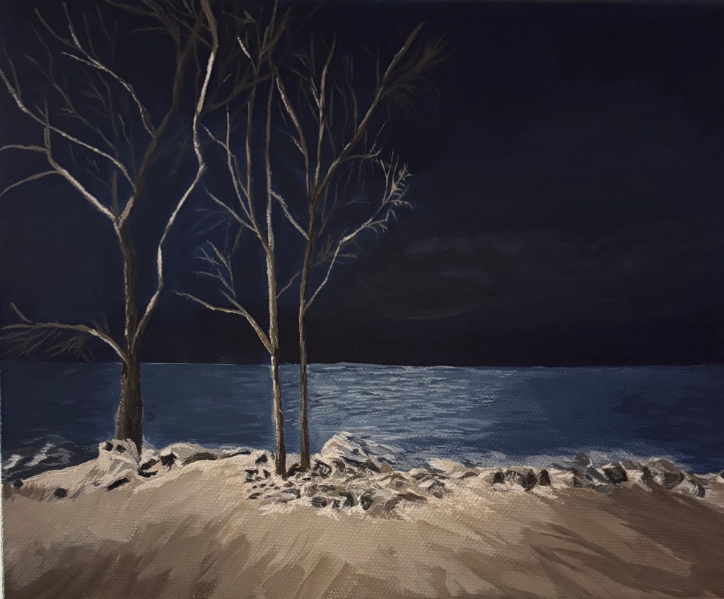 Spring emerging – acrylic – 11”x14” on canvas – It captures the opening of spring at Prequille Provincial Park with Lake Ontario’s blue waters and the contract of dark trees against a light sky. Inspired by the retreat of ice along the shore line and the promise of warmer weather to come.