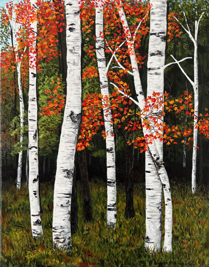 “Birches In Fall” – acrylic on canvas 11″ x 14″ is meant to evoke a sense of peaceful reflection and quiet warmth. The vibrant autumn colous and slender white trunks of the Birch Trees create a feeling of gentle calm, as if I was standing quietly in the woods and breathing in the crisp fall air.