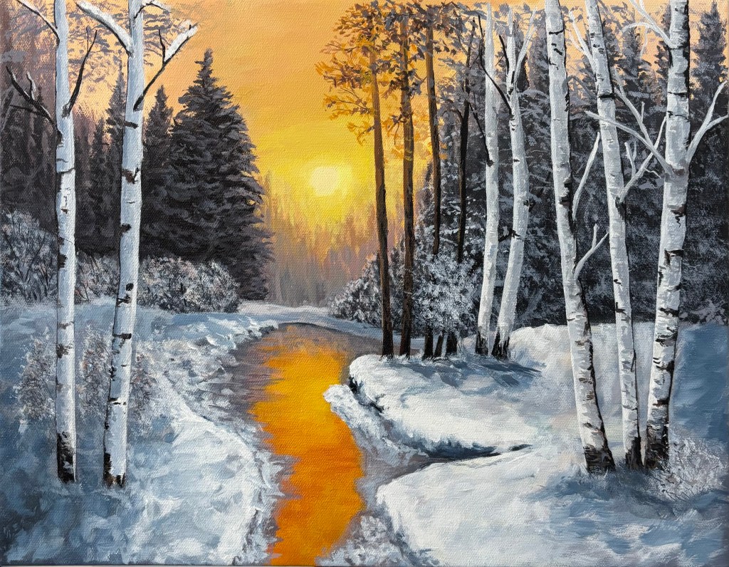 “Birches In Fall” – acrylic on canvas 11″ x 14″ is meant to evoke a sense of peaceful reflection and quiet warmth. The vibrant autumn colous and slender white trunks of the Birch Trees create a feeling of gentle calm, as if I was standing quietly in the woods and breathing in the crisp fall air.