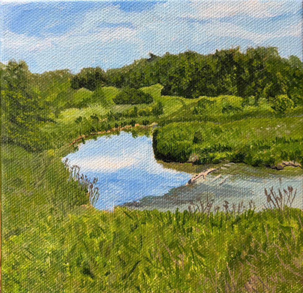 “Back In The Hood” – 6″ x 6″ acrylic on gallery stretched canvas block. The edges are painted as a continuation of the painting making it ready to mount on a wall or set upon a table without a frame required. Rogers Reservoir Conservation Area – or as we call it in “the Landing” – a playground for my son and his friends who grew up around this area. They loved the freedom and the adventures and I loved the safety and the unobstructed view. A photo taken a few years ago by a neighbour and friend triggered some very fond memories.