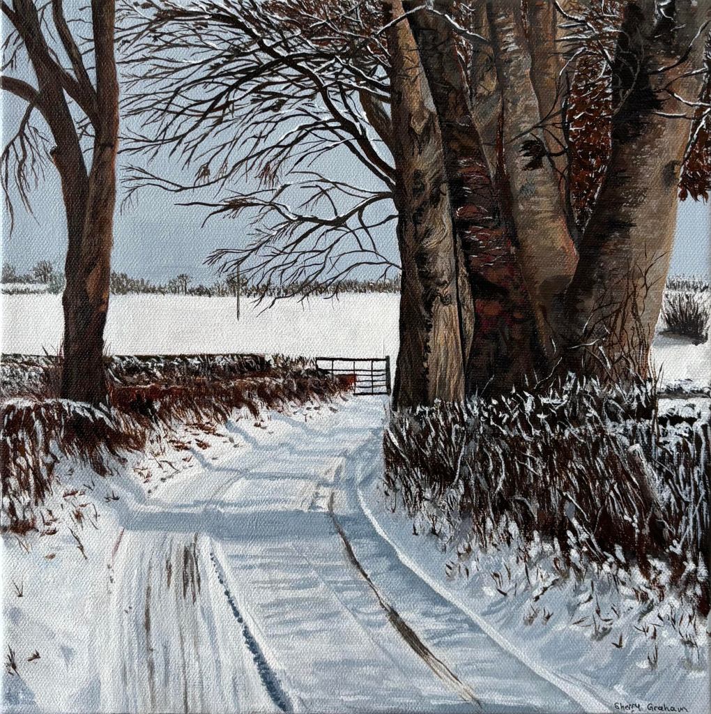 “Winter Path” – 12″ x 12″ acrylic on gallery stretched block canvas. Sides are painted so that no frame is really necessary. This photo (photo credit James Burke with permission) depicts a quiet wintery path through snow and stillness, where the trees stand close and the season lingers. I was drawn to the way in which winter is holding the dead maple leaves hostage and left dangling on the branches in the background. The intertwined trunks and branches were fascinating and drew my eye more often than not. I hope you find the peace I found when viewing this scene. My style is photorealism and the details are where my heart lies.